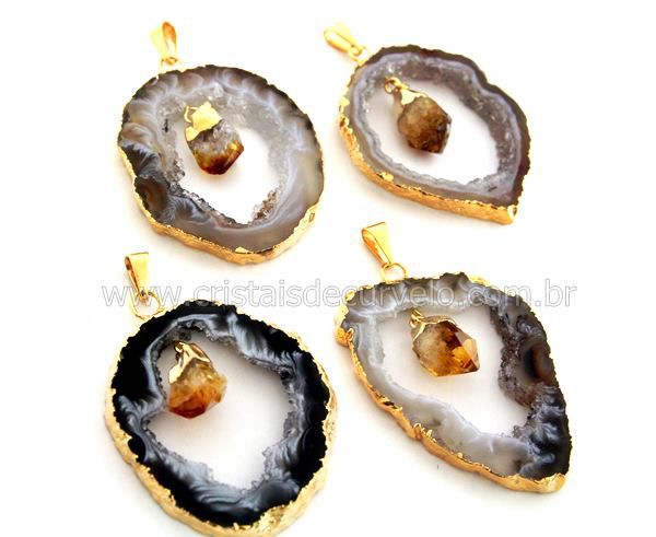 Pingente Chapa Geodo e Ponta de Citrino Movel, Especial Pedra Agata Natural Montagem Envolto com perinha para passar o cordão Pedra Genuina com origem garimpo lapidação e montagem Envolto em Dourado manual