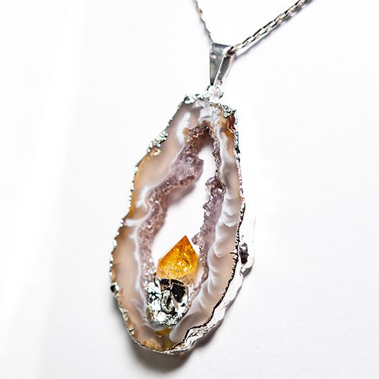 Pingente Chapa Geodo e Ponta de Citrino Fixa Especial Pedra Agata Natural Montagem Envolto com perinha para passar o cordão Pedra Genuina com origem garimpo lapidação e montagem Envolto em Banho Prateado
